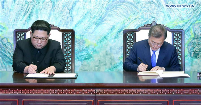South Korean President Moon Jae-in (R) and Kim Jong Un, top leader of the Democratic People's Republic of Korea (DPRK) sign for their joint declaration, titled the Panmunjom Declaration for Peace, Prosperity and Unification of the Korean Peninsula, at Peace House on the South Korean side of Panmunjom, on April 27, 2018. (Xinhua/Inter-Korean Summit Press Corps)