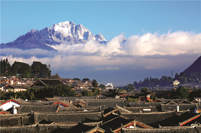 A view of Yunnan's Lijiang Ancient Town under Yulong Snow Mountain