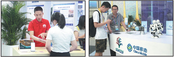 From left: A Huawei representative introduces company products to a visitor. China Mobile’s Kunming branch company is the operator of the 5G experience zone.