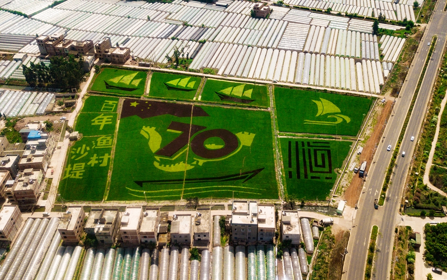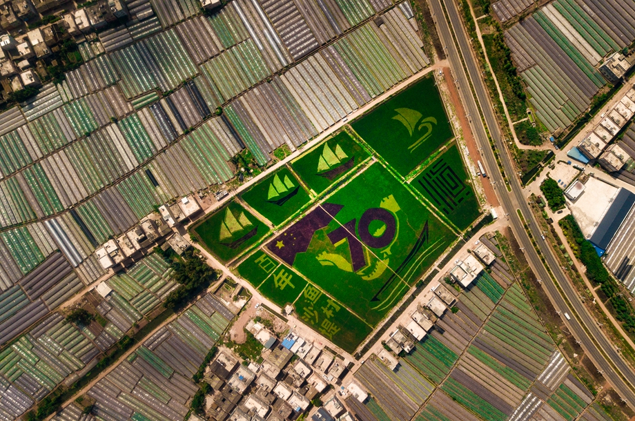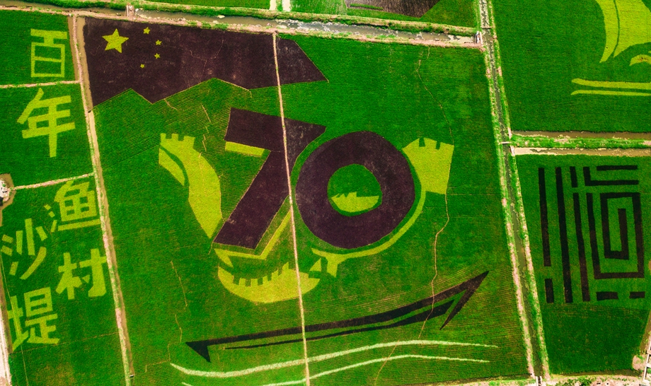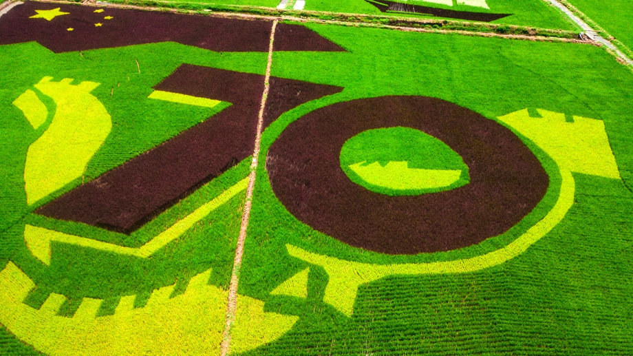 In a four-hectare rice field set aside for traditional rice farming in Shadi Village of Kunming's Jinning District, local famers created a huge "painting" to mark the 70th anniversary of the founding of the People's Republic of China (PRC).