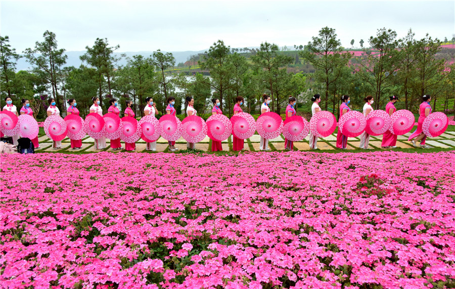 Women dressed in qipao pose for a group photo in Taiping Lake town in Yunnan province. [Photo by Pu Jiayong/for chinadaily.com.cn]