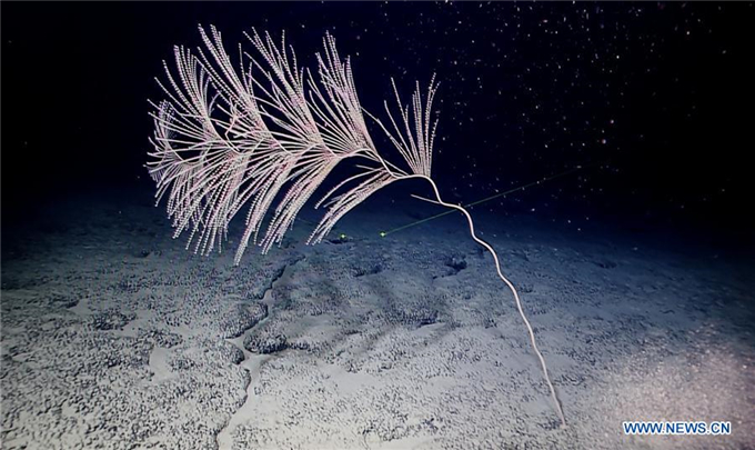 Photo taken on April 11, 2018 shows the coral on Magellan Seamounts in the west Pacific. Chinese scientists on board research vessel Kexue, or "Science" literally, conducted research on the Magellan Seamounts in the west Pacific. (Xinhua/Zhang Jiansong)
