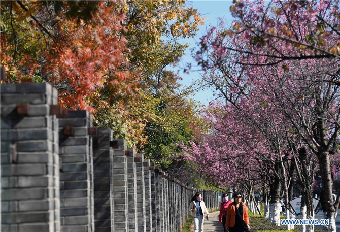 Blossoming flowers are seen along a sidewalk in Xishan District in Kunming, southwest China's Yunnan Province, Dec. 21, 2018. Kunming is a well-known tourist attraction for its mild climate and year-round greenery. (Xinhua/Yang Zongyou)