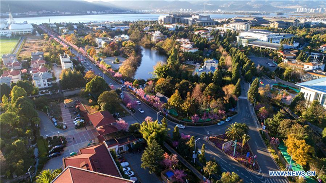 Aerial photo taken on Dec. 25, 2018 shows buildings beside the Dianchi Lake during sunny winter weather in Kunming, capital city of southwest China's Yunnan Province. (Xinhua/Lin Yiguang)