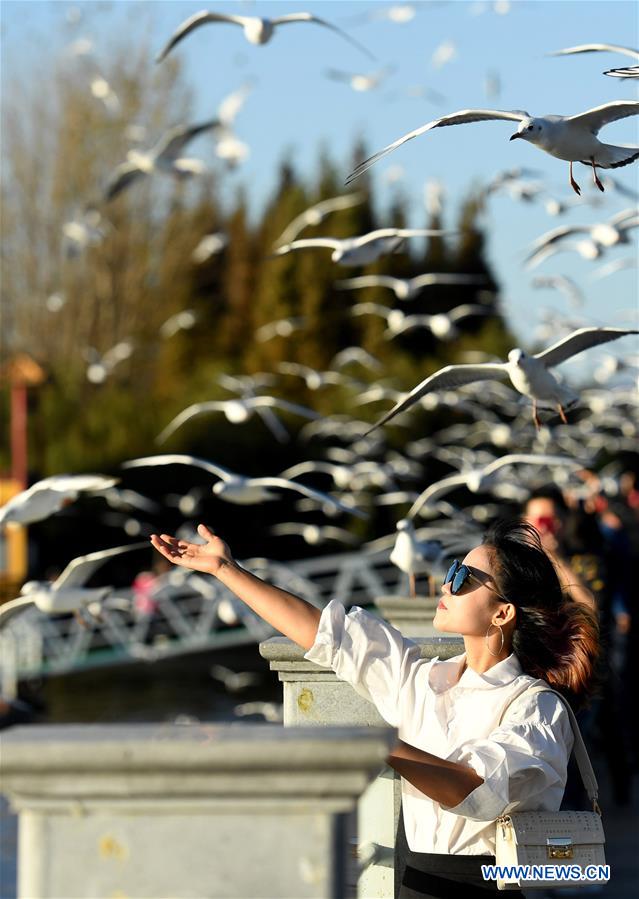 People feed red-billed gulls at Dianchi Lake in Kunming, capital of southwest China's Yunnan Province, Nov. 14, 2018. Red-billed gulls fly to Kunming for warmer weather to live through the winter. (Xinhua/Lin Yiguang)
