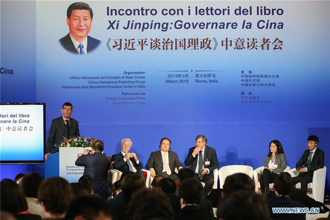 Guests attend a seminar on "Xi Jinping: The Governance of China" in Rome, Italy, March 20, 2019. Readers at a seminar on "Xi Jinping: The Governance of China" held here Wednesday said the book impressed them and facilitated a better understanding of the Asian country. About 200 guests, including officials and political figures from China and Italy, engaged in in-depth discussions at the event, which took place on the eve of Chinese President Xi Jinping's state visit to the European nation. (Xinhua/Zheng Huansong)