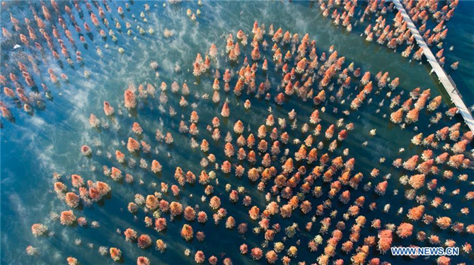 Aerial photo taken on Jan. 5, 2019 shows the wetland of dawn redwood which is clad in mist in Dianwei Village in Panlong District of Kunming, capital of southwest China's Yunnan Province. The wetland is located at Songhuaba water source reserve, also the upper reaches of the Dian Lake. Songhuaba water source reserve is the main drinking water source of Kunming City. Ecological remediation measures have been implemented for ten years in this area to protect the environment. (Xinhua/Qin Qing)