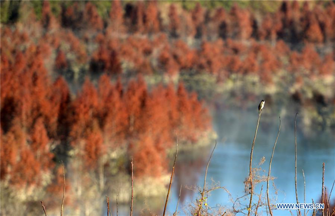 A bird rests on a branch at the wetland of dawn redwood in Dianwei Village in Panlong District of Kunming, capital of southwest China's Yunnan Province, Jan. 5, 2019. The wetland is located at Songhuaba water source reserve, also the upper reaches of the Dian Lake. Songhuaba water source reserve is the main drinking water source of Kunming City. Ecological remediation measures have been implemented for ten years in this area to protect the environment. (Xinhua/Qin Qing)