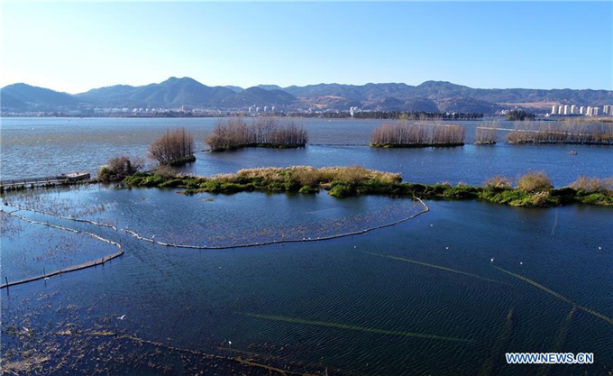 Aerial photo taken on Feb. 2, 2019 shows the scenery of a wetland in Dianchi Lake, the largest fresh water lake on the Yunnan-Guizhou Plateau, in Kunming, capital of southwest China's Yunnan Province. (Xinhua/Qin Qing)