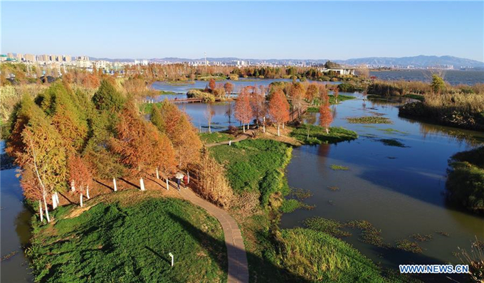 Aerial photo taken on Feb. 2, 2019 shows the scenery of the Haidong wetland park in Dianchi Lake, the largest fresh water lake on the Yunnan-Guizhou Plateau, in Kunming, capital of southwest China's Yunnan Province. (Xinhua/Qin Qing)