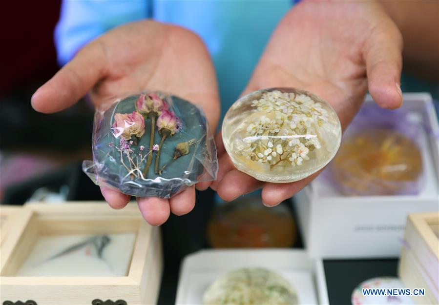 A staff member displays an essential oil soap (R) and a scented wax added with flowers at on the promotion event.